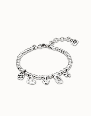 Ispirato alla ricerca della buona fortuna, questo originale bracciale è bagnato nell'argento ed è costituito da vari pezzi perlati accompagnati da quattro ciondoli dalla forma di cuore, germoglio, lucchetto e mano. Il gioiello, dal carattere multisimbolico, è stato realizzato in Spagna da UNOde50 secondo un procedimento artigianale.
