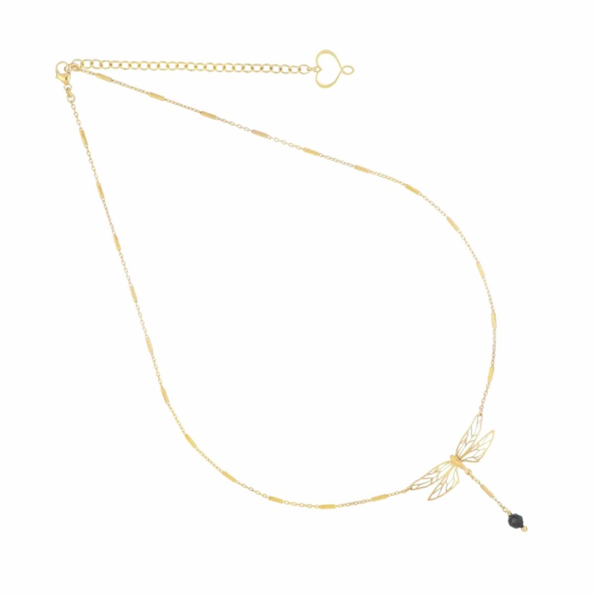 Girocollo in argento 925 con galvanica oro giallo ad alto spessore e ad alta resistenza. Il Girocollo presenta una libellula in lastra bidimensionale finitura lucida e corpo graffiato di dimensioni 3 cm con sfera di spinello sfaccettato di 4mm all'estremità della coda.