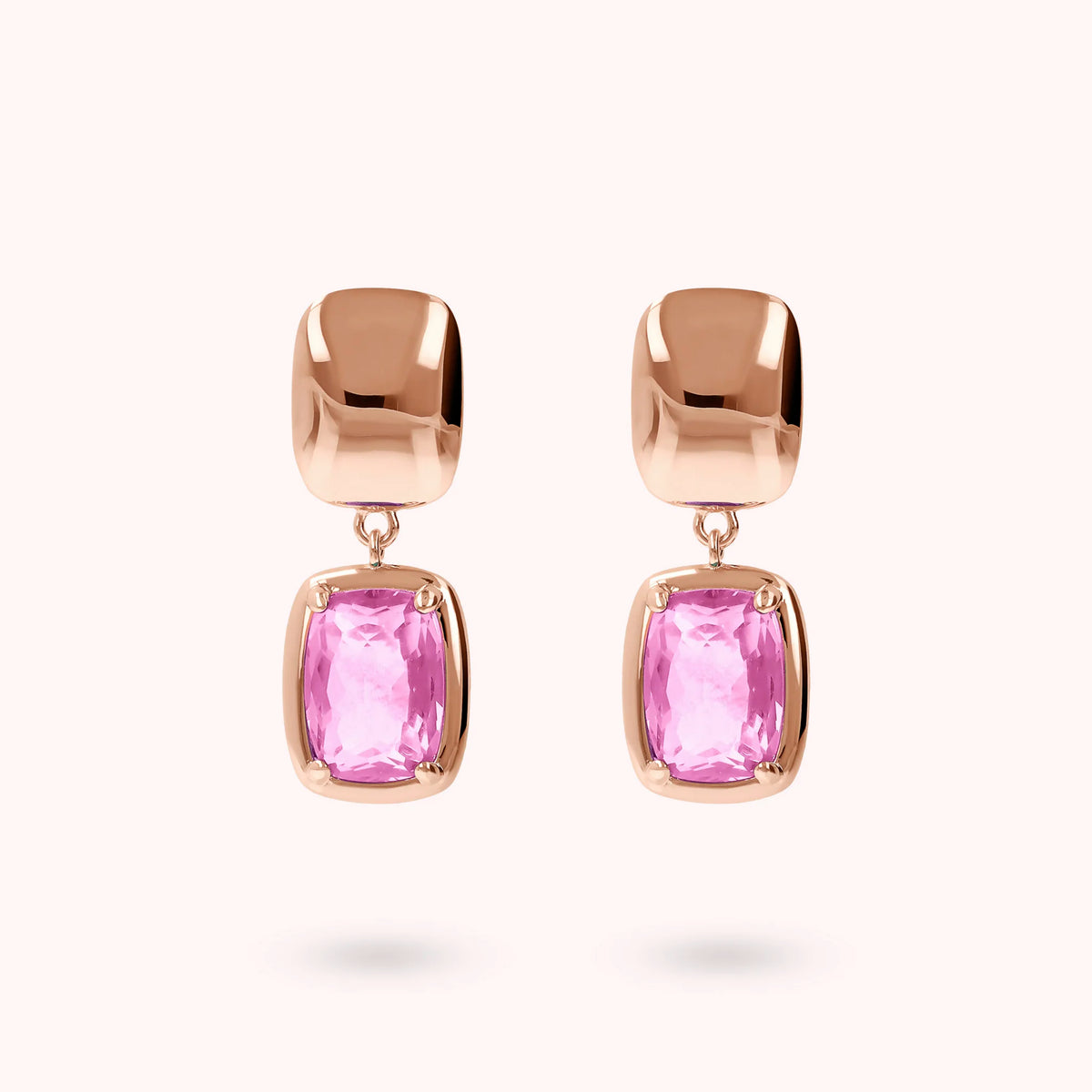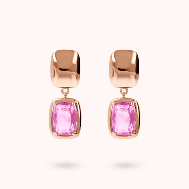 Orecchini pendenti Bronzallure realizzati in lega Golden Rosé, placcata Oro rosa 18kt, con contro-maglia rettangolare lucida (13x9 mm) e ciondolo con pietra prisma gem dal taglio a baguette (11x8 mm). Lunghezza 3 cm. Chiusura a perno e farfalla.