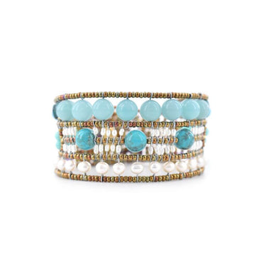 Composizione: Amazonite, Ametista, Ottone placcato oro, Magnesite, Perle di vetro di Murano, Turchese, Perle d’acqua