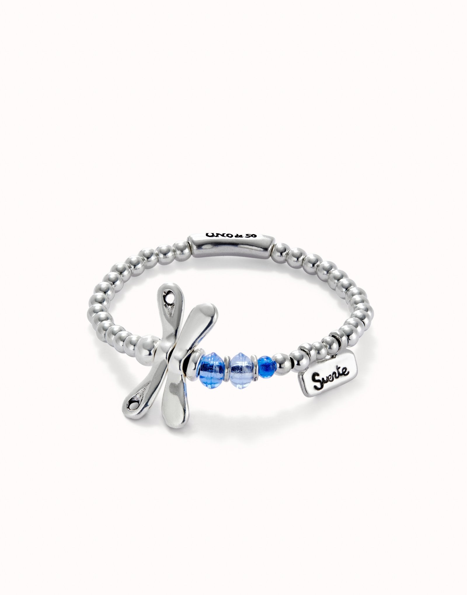 Bracciale elastico con libellula placcata in argento e cristalli blu. Prodotto in Spagna con un processo artigianale al 100%.Su questi pezzi la libellula diventa la gran scommessa della stagione e li trasforma in veri simboli di ribellione, combinati con cuoio, cristalli colorati o maglie. Scopri la collezione Ser rebelde.