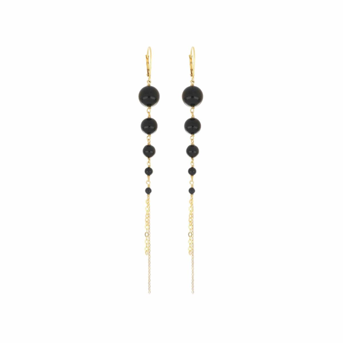 Coppia di orecchini a monachella con cinque pietre di agata nera liscia in dimensioni crescenti e catene finali.