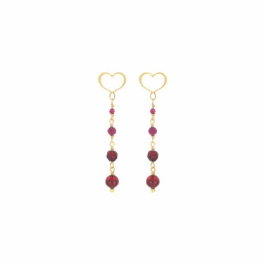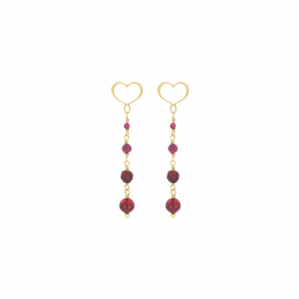 Presenta cuore Maman traforato e catena rosario con quattro pietre in diverse dimensioni: due rubini e due granati.