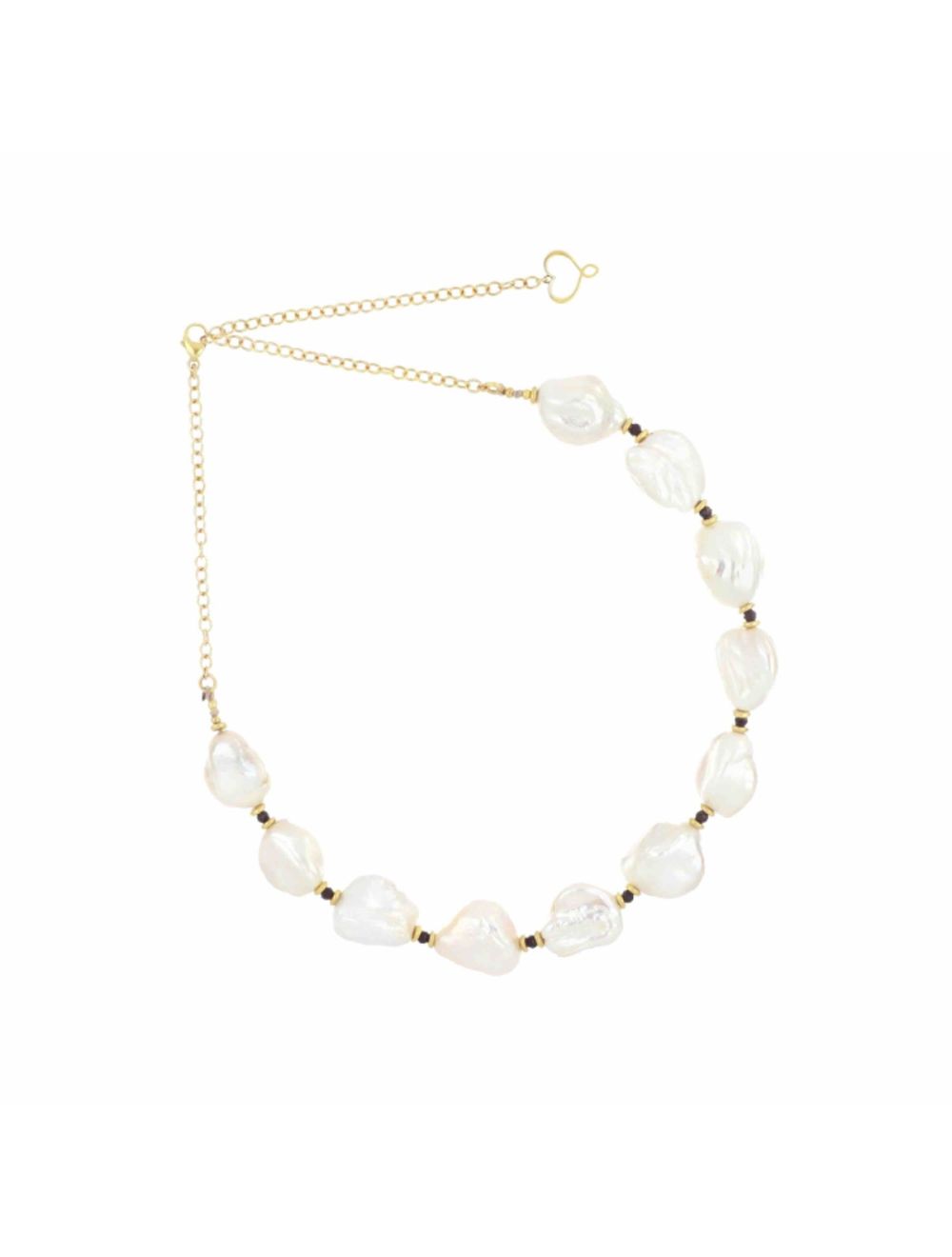 Girocollo realizzato in argento 925 con galvanica oro giallo ad alto spessore e resistenza con Perle scaramazze naturali irregolari. Tra una perla e l'altra sono presenti elementi cilindrici decorativi e pietre di spinello sfaccettato di 2,5 mm.
