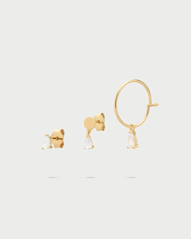 Set di orecchini composto da un cerchietto con goccia pendente, un orecchino a lobo con bottone e goccia pendente e un orecchino a lobo con goccia tappabuco