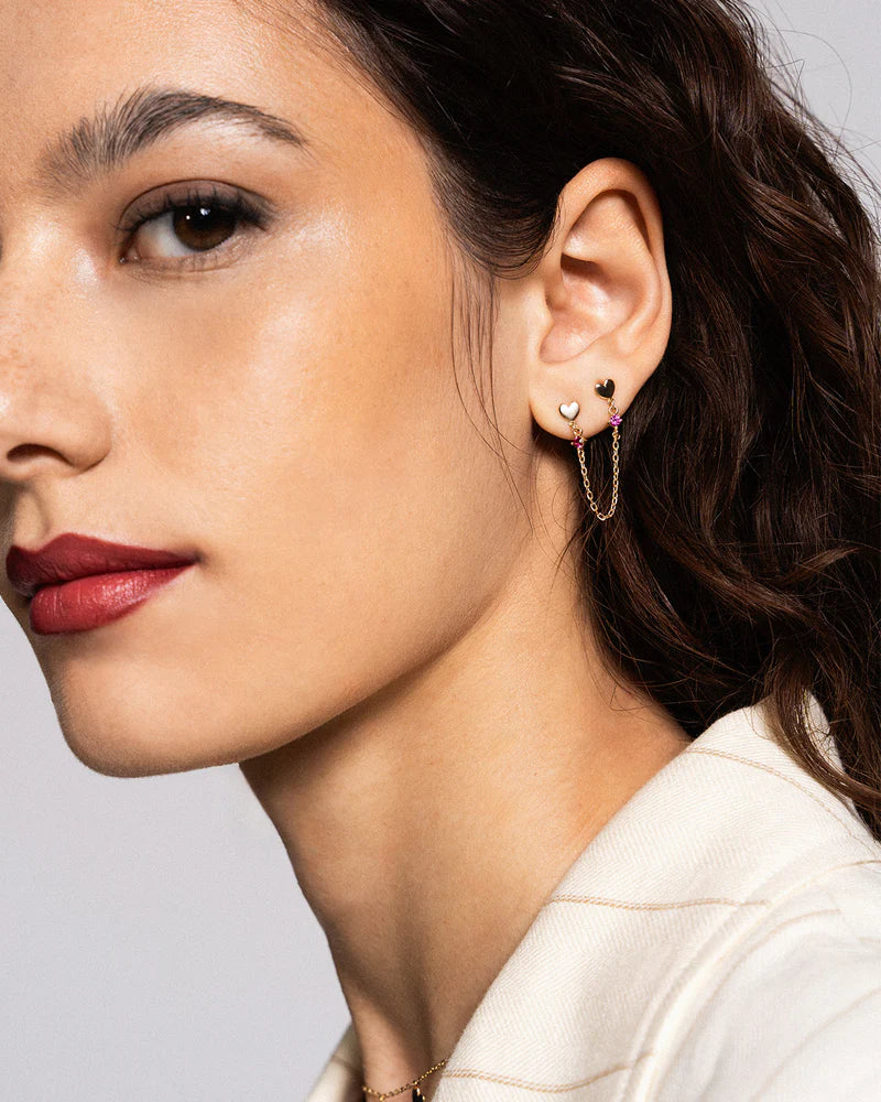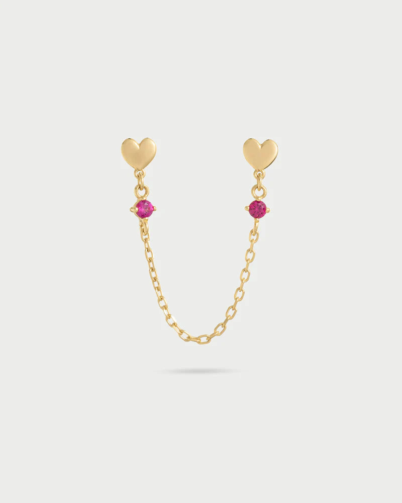 Orecchini double a lobo cuore tappabuco con catenella e pendente in zircone rosso